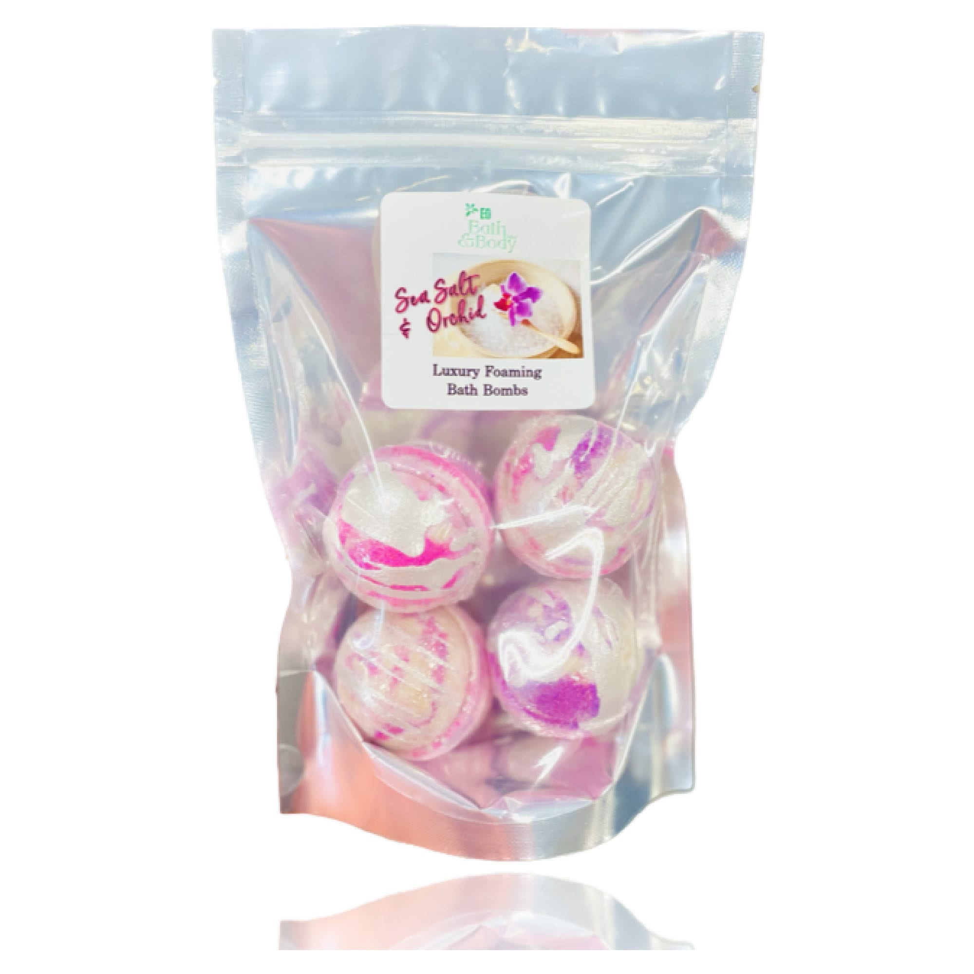 A Skin-Loving Gift Bag of 4 Foaming & Fizzing Organic Shea Butter Bath Bombs in the Gorgeous Sea Salt & Orchid Scent.